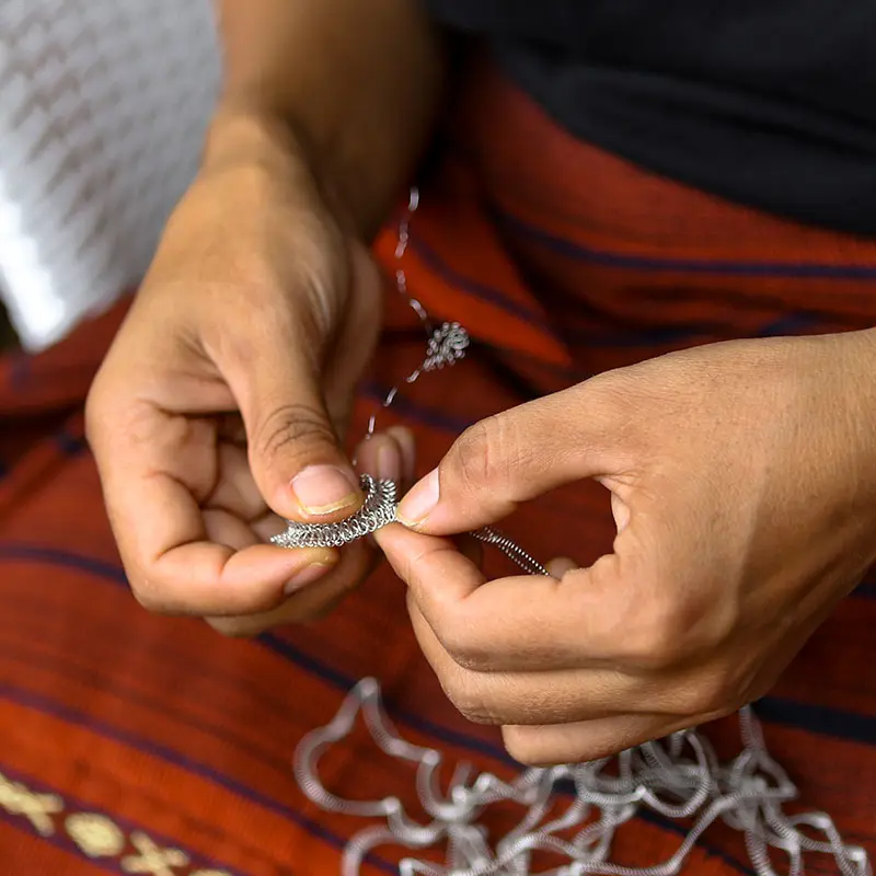 MANAMU is a female-owned social enterprise, founded in 2019 by Melania Karolina. She collaborates with talented artisans from Sumba Island, in the Eastern part of Indonesia, to keep the ancient art of wire mesh weaving, or LULU AMAH alive. This is a timeless expression of love and heritage woven with the soul of Sumba. Sumbanese artisans weave metal wire threads into exquisite jewellery to symbolize not only the enduring bond between couples but also the rich cultural legacy of Sumba.